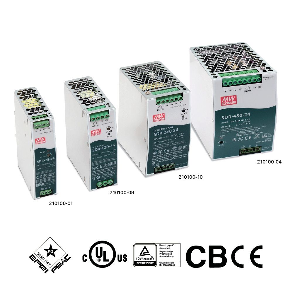MeanWell strømforsyning til montering på DIN-skinne i styreskabe.