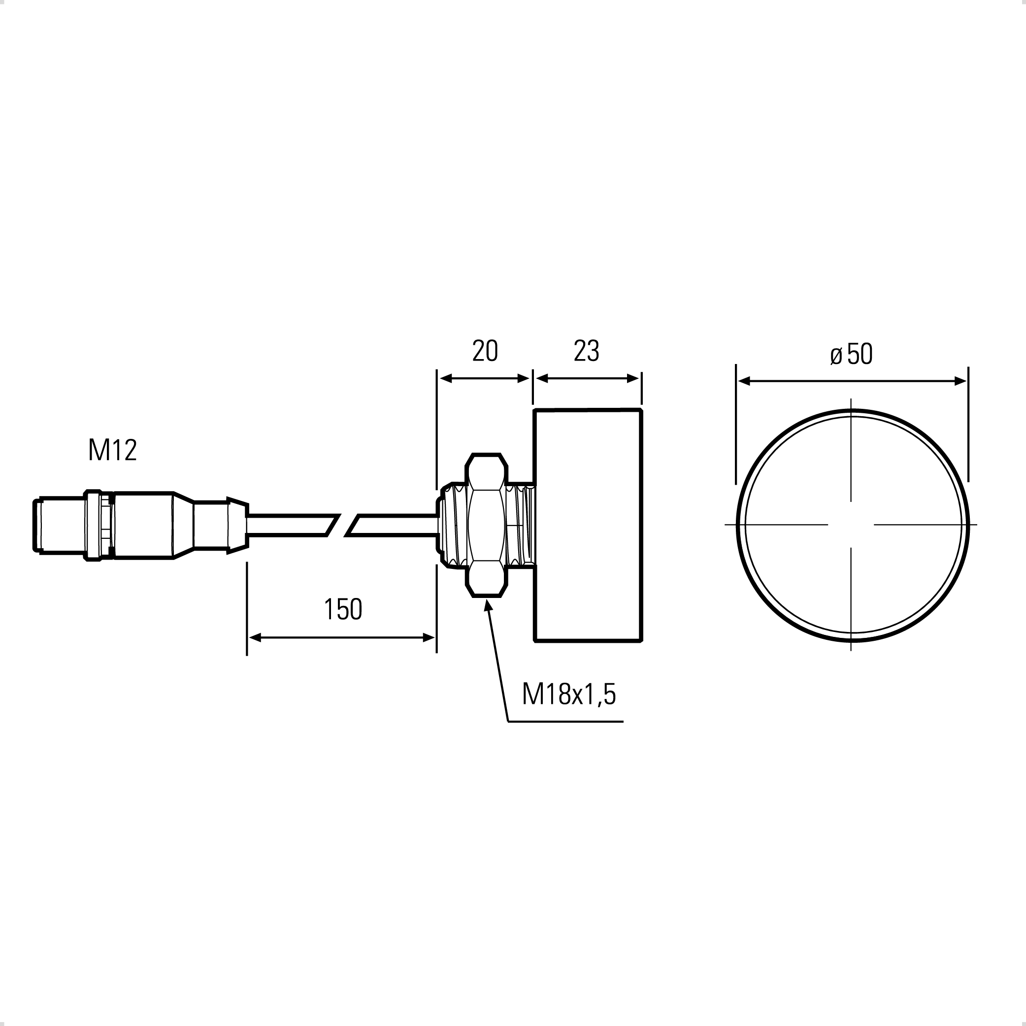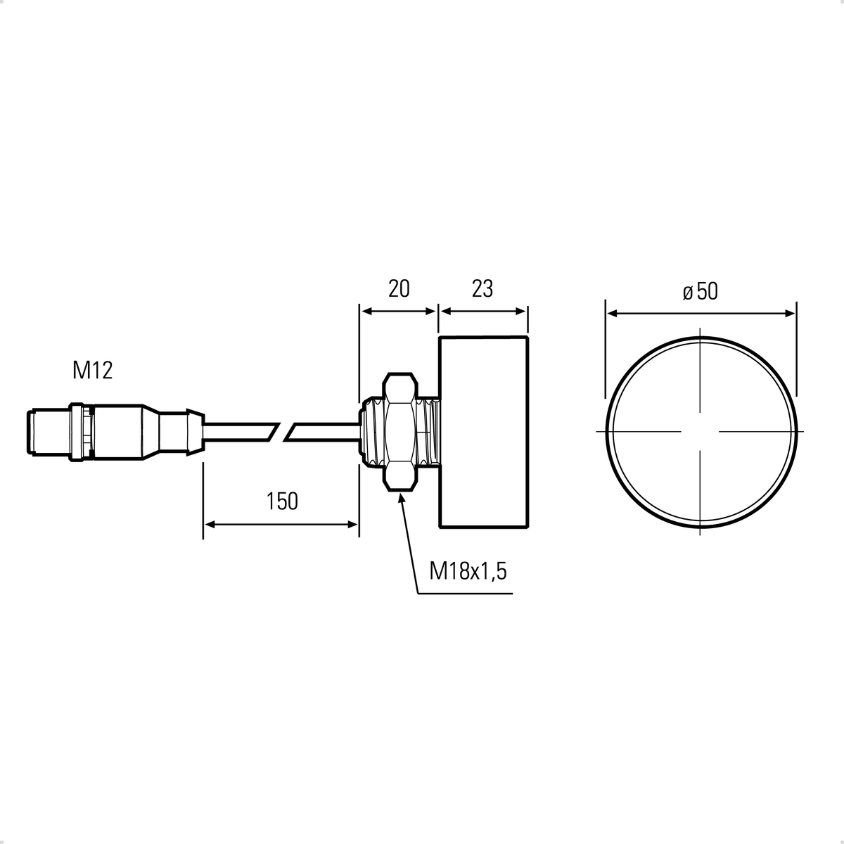 Tilslutning: 150mm ledning med M12 hanstik.